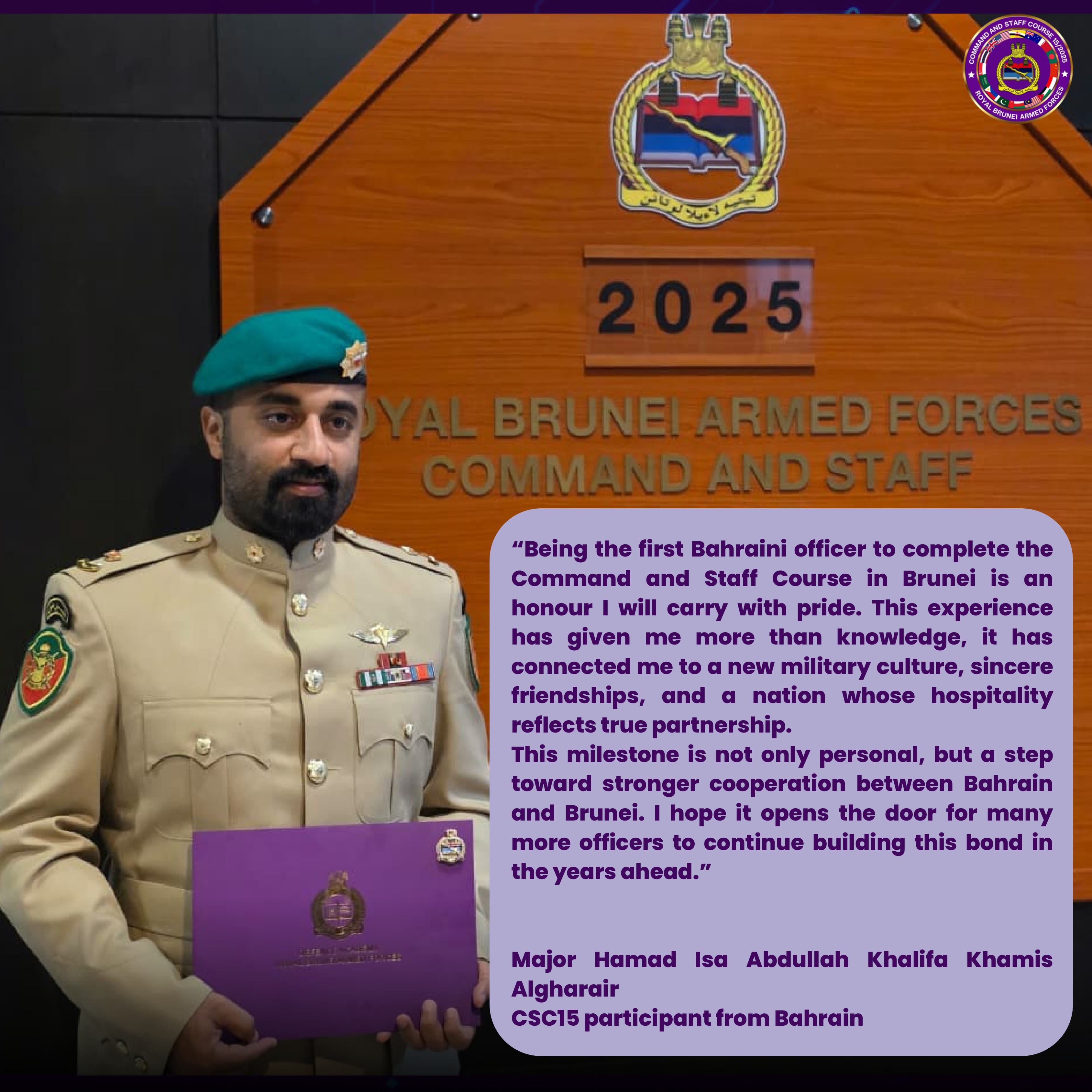 This year’s course also marked a historic milestone with Major Hamad Algharair from Bahrain becoming the first Bahraini officer to complete the Command and Staff Course in Brunei, a moment that symbolises the strengthening of defence cooperation and enduring friendship between both armed forces.